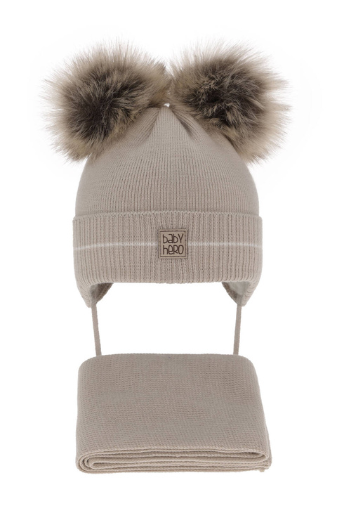 Pojke vinter set: mössa och halsduk, kremowy, med två pompommar, knytband, Jewel
